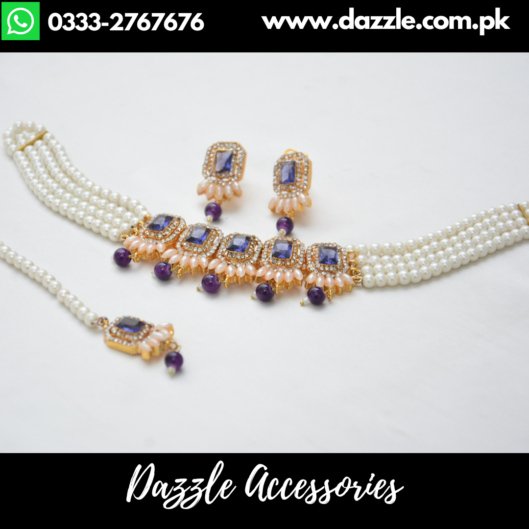 Necklace set Featuring lustrous blue pearls, a beautifully crafted choker, matching earrings, and a delicate bindiya, this set enhances your style with graceful charm. Perfect for weddings, receptions, and traditional events.