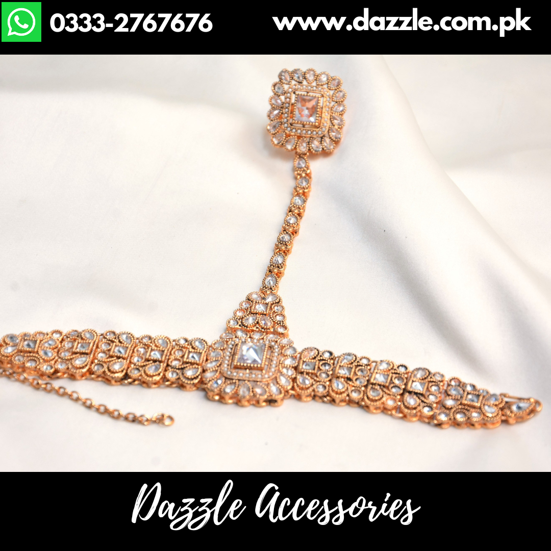 Classic Champagne Angla Bracelet is a beautifully crafted traditional jewelry piece that reflects rich cultural heritage and royal elegance. Designed with high-quality kundan stones and a classic Angla pattern, this jewelry adds a graceful and luxurious jewelry in Pakistan.