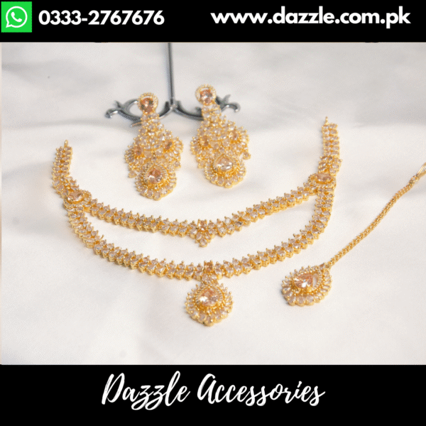 Golden Double Layer Bridal Set a masterpiece of elegance and sophistication. Crafted with premium 18K gold plating, this choker set shines with brilliant zirconia stones and authentic handcrafted stonework, making it a perfect choice for modern brides who love a blend of tradition and glamour.