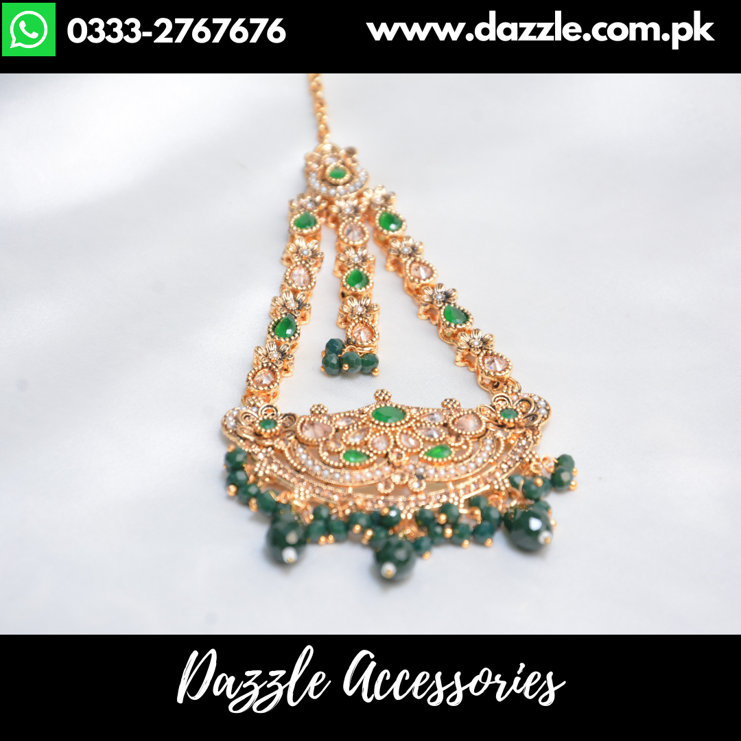 Green Jhomar for Mehndi designed to bring classic charm to modern bridal and festive styling. Crafted with intricate detailing and shimmering stones, it drapes gracefully along the side of the face, giving a royal and radiant appearance.