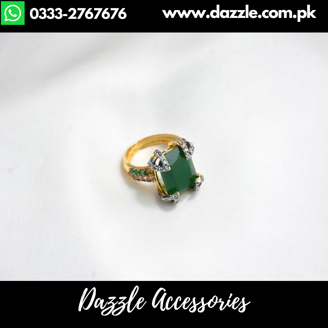 Green Statement Ring Adjustable Size designed to add a bold and luxurious touch to any look. Featuring a rich ruby-red stone set in a high-shine gold-plated finish, this ring is perfect for parties, weddings, and festive occasions. Its elegant statement design makes it an eye-catching accessory for women who love timeless glamour.