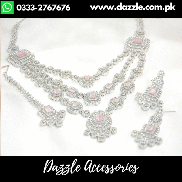 Triple Layer Silver Pink Statement Bridal Set , a masterpiece of elegance and sophistication. Crafted with premium 18K gold plating, this choker set shines with brilliant zirconia stones and authentic handcrafted stonework, making it a perfect choice for modern brides who love a blend of tradition and glamour.
